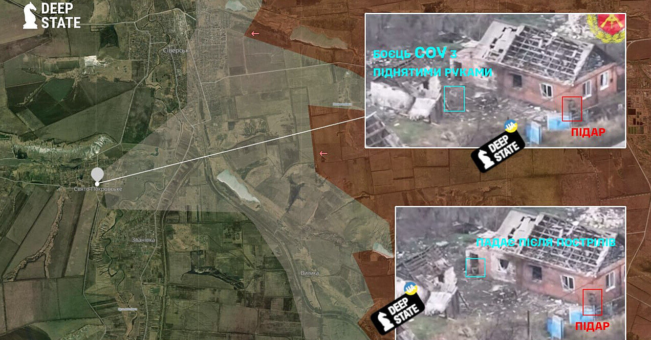 Російські військові розстріляли українського військовополоненого у Свято-Покровському Бахмутського району Донецької області. З посиланням на дані аналітичного проекту DeepState.За даними аналітиків, це сталося у населеному пункті Свято-Покровське, розташованому на південь від Сіверська.DeepState зазначає, що на опублікованому ворогом відео зафіксовано, як штурмова група російських військових бере у полон солдата Сил оборони: боєць виходить із укриття з піднятими руками, після чого одразу отримує чергу з автомата та падає на порозі будинку.Аналітики також звертають увагу на локацію відео."Додатковий інтерес викликає локація, адже ворог діє вже за річкою Бахмутка. Крім того, зараз складно зрозуміти реальну ситуацію в Сіверську", – йдеться у повідомленні.