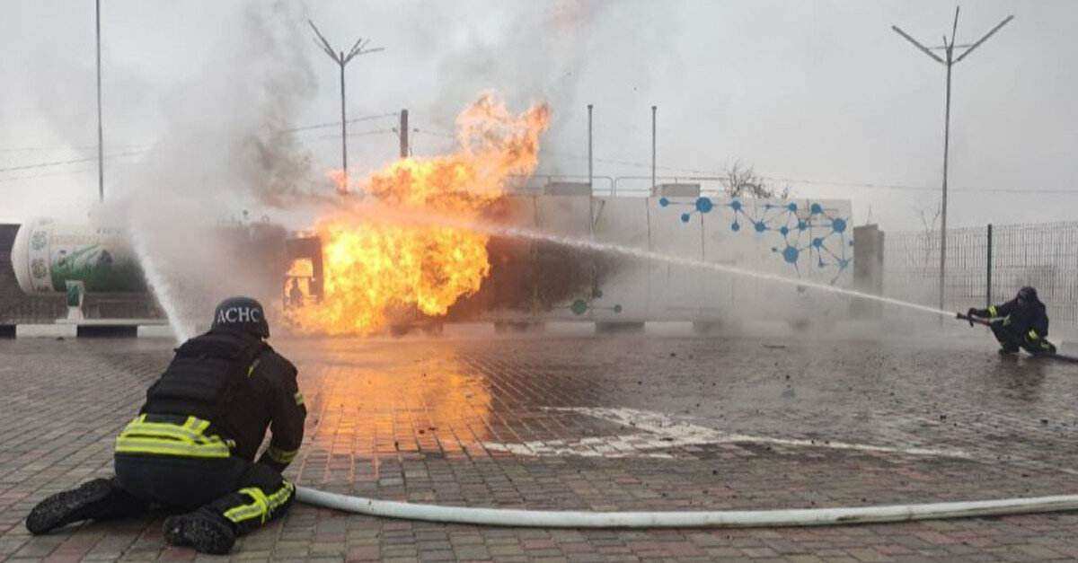 Пошкоджена АЗС. Там сталася пожежа, яку рятувальники вгамували. Понівечений інфраструктурний об’єкт".