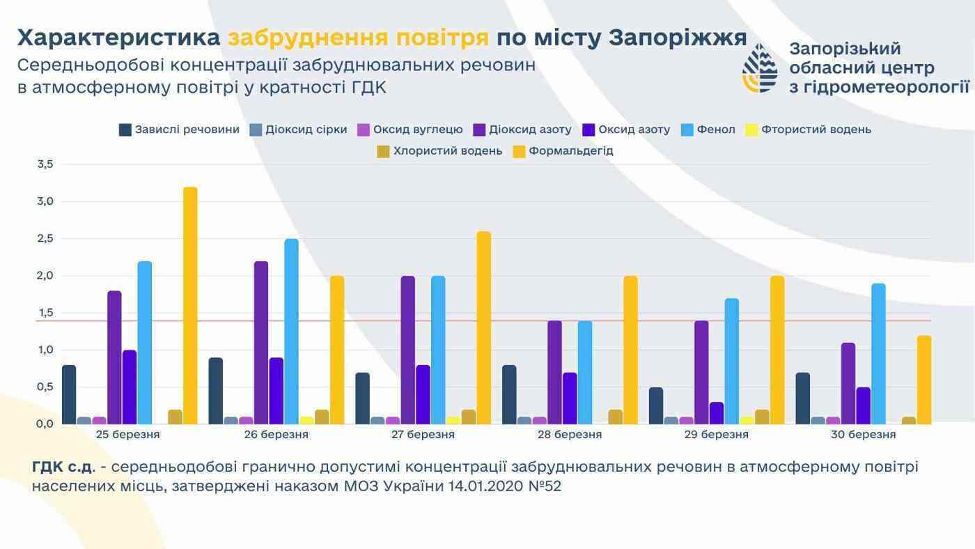 Лабораторія спостережень за забрудненням природного середовища здійснювала дослідження з 25 по 30 березня. Зареєстровані перевищення гранично допустимої середньодобової концентрації низки домішок у атмосферному повітрі. Відхилення виявили за показниками: діоксид азоту (1,1 – 2,2 ГДК с.д.), фенол (1,4 – 2,5), формальдегід (1,2 – 3,2).